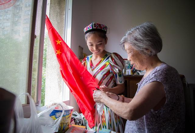来自新疆的维吾尔族姑娘阿丽米热和娜迪拉木热情地敲开了80岁婆婆张华荣的大门,说明来意后,张婆婆笑眯眯地将她们拉进了家,口里连声说着“欢迎,欢迎!”阿丽米热将国旗送到了张婆婆手中,并一起将国旗挂到了阳台上。挂完国旗,张婆婆亲切地问她:“你们从新疆来武汉上学,还习惯吗?”阿丽米热点点头说:“挺习惯的,武汉这边老师和同学都挺好”。临走前,张婆婆高兴地对两个小姑娘说:“国庆是国家的生日,你们送来的国旗很有意义,谢谢你们了!”