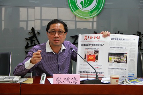 图为张孺海通过楚天都市报讲解媒体新闻 摄影:金晶