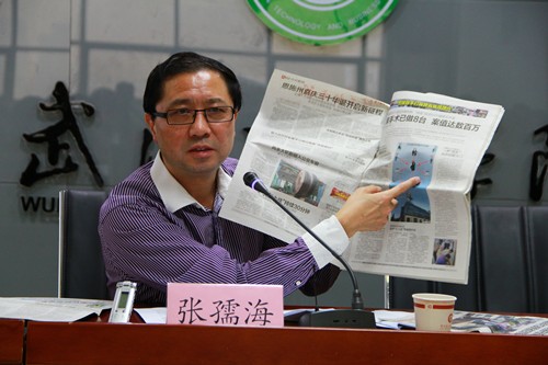 新闻中心讯(见习记者隗晓璐李雄风)10月17日下午,楚天都市报常务副总编辑张孺海在米乐mile官方网站第三会议室,为该校新闻中心大学生记者团、广播台、电视台70多名学生记者做了主题为“媒体融合下的纸媒坚守”的讲座。讲座由宣传策划部部长狄奥主持。