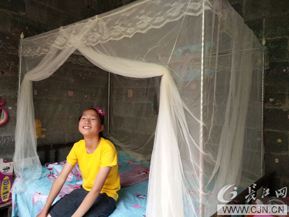 志愿者为留守女童换上了新蚊帐,一位女童坐在床边高兴极了