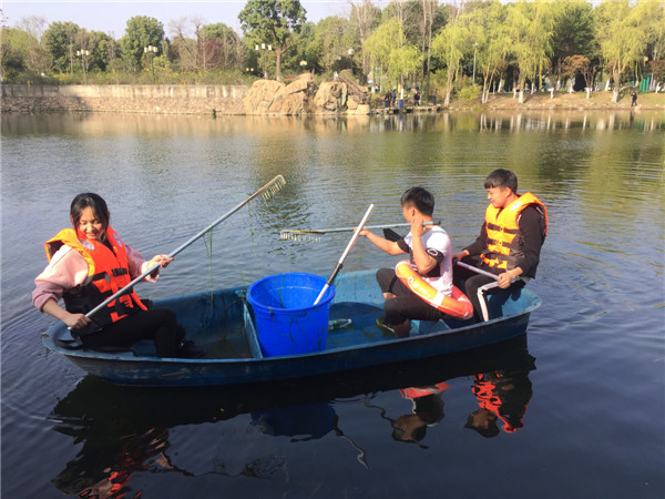 随后,老师们纷纷带头拿起了耙子等工具,清理湖里的水草,同学们也快速分组投入工作。只见男生们穿着救生衣划船去湖中心清理垃圾,女生们则在湖边就近清理水草,每个人都怀着饱满的热情,不怕脏不嫌累,利用手中的各种工具撸起袖子加油干,不放过任何一个角落,静思湖的清理工作井然有序地进行着。