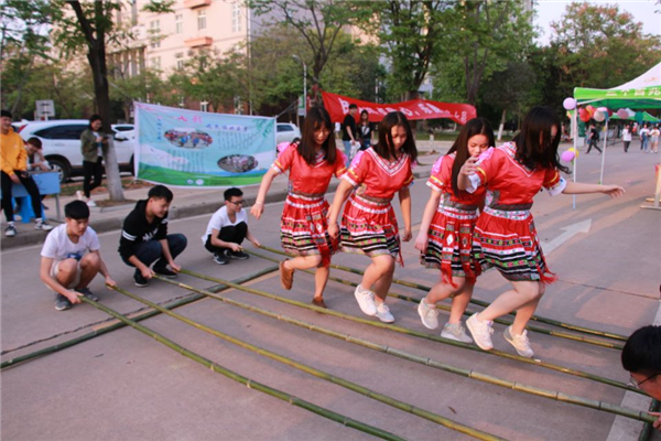 图为同学们在跳竹竿舞 摄影:车瑭甜