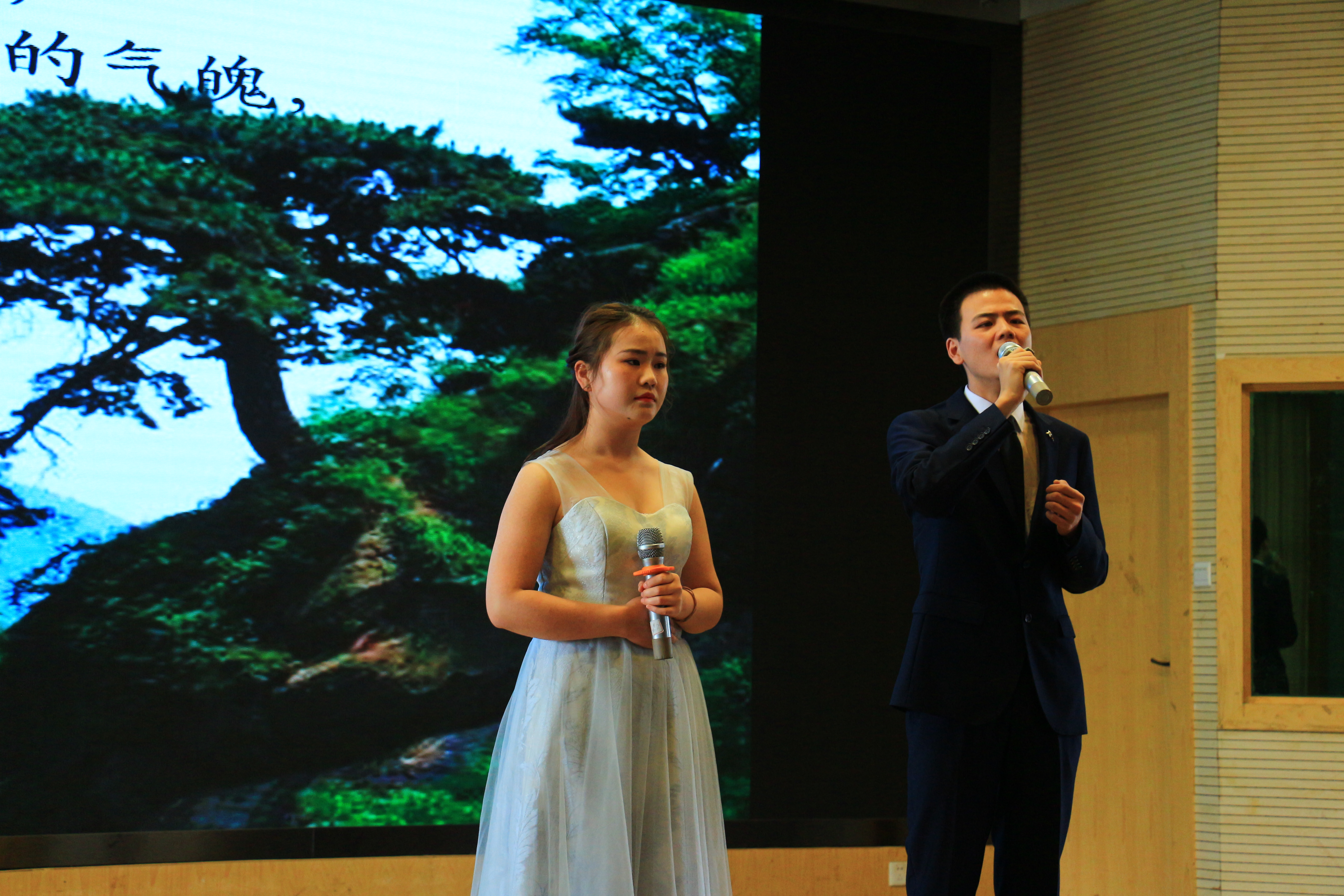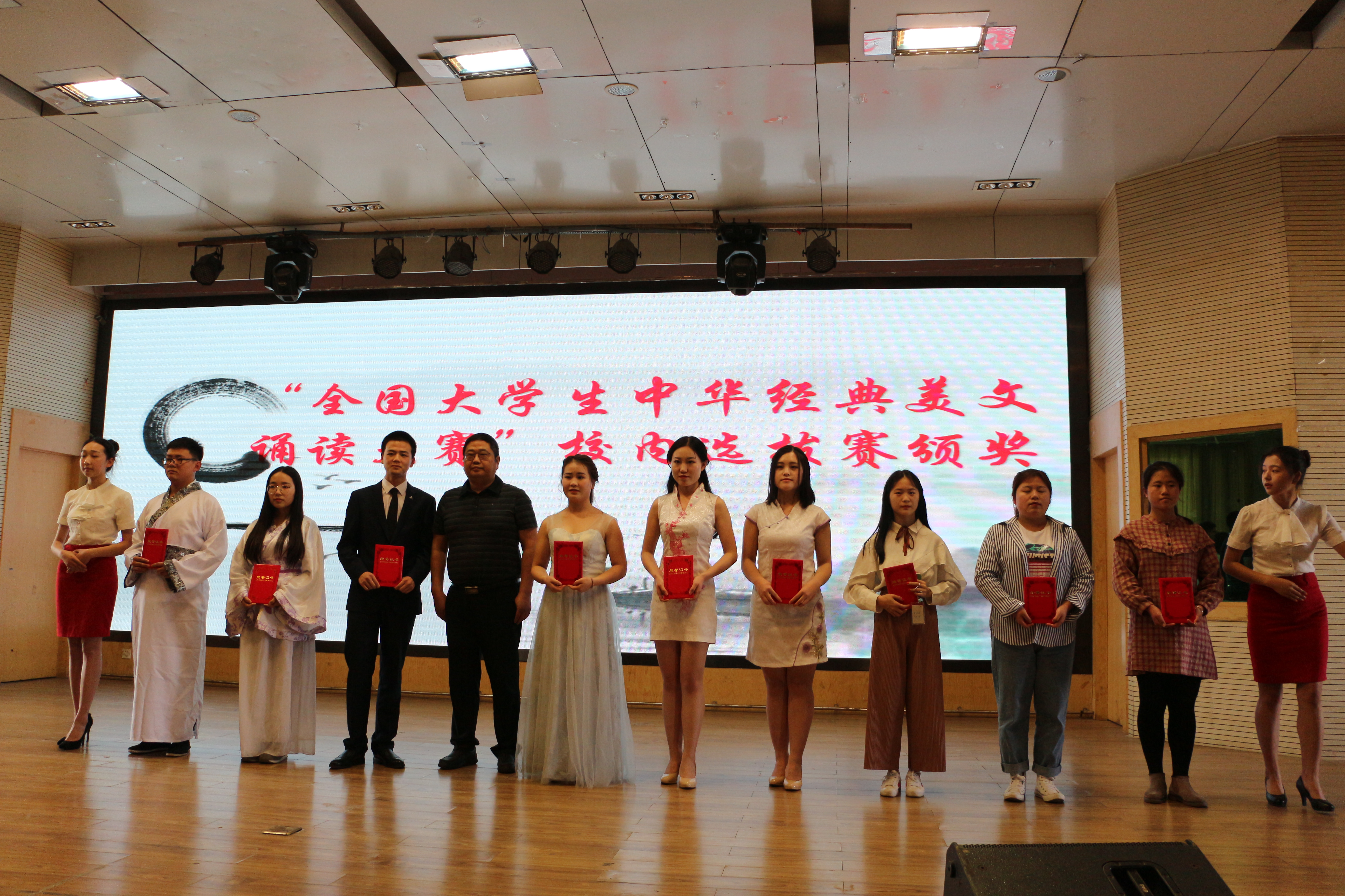 吴敏部长为“全国大学生中华经典美文诵读大赛”校内选拔赛获奖者颁奖。颁奖之后,获奖的学生代表现场还进行了朗诵表演。彭银珍和任豫媛带来的《道德经》声情并茂,生动传神;朱明星和牟钰华带来的《我的祖国》气势磅礴,铿锵有力;张思志和张琳带来的《水龙吟》《卜算子》婉转悠扬,他们的朗诵加上自己拍摄的视频作为背景,可谓情景交融,令人陶醉。