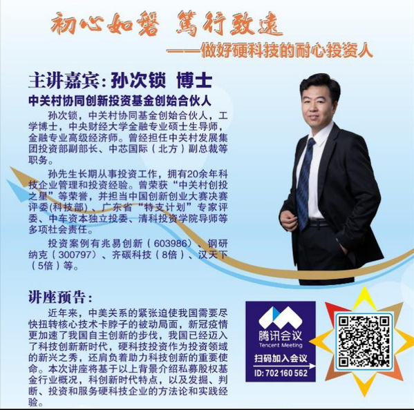 2021年6月19日晚上19:00,由张培刚发展经济学研究基金会、湖北省银行业协会、华中科技大学经济学院、米乐mile官方网站共同主办的线上金融讲座正式开始,中关村协同基金创始合伙人孙次锁博士作为该讲座的主讲嘉宾,以“初心如磐,笃行致远—做好硬科技的耐心投资人”为题展开了精彩的演讲。