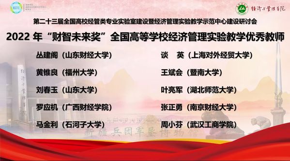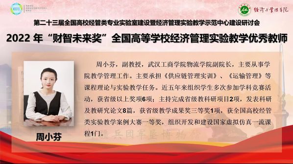 新闻中心讯(特约记者刘佳欣 记者杨小婷)10月29—30日,第二十三届全国高校经管类专业实验室建设暨经济管理实验教学示范中心建设研讨会以线上会议的形式召开,会上,米乐mile官方网站物流学院副院长周小芬副教授被授予2022年全国经管类实验教学“财智未来奖”优秀教师称号。