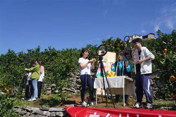 新闻中心讯(特约记者 舒娟 记者 杨小婷)“我们的脐橙个个甘甜圆润,是不是很想吃?这是因为九畹溪镇得天独厚的自然条件使得这些橙子色泽红润、口感鲜美,赢得了人们的广泛喜爱”,10月29日上午,在宜昌市秭归县九畹溪镇一处脐橙种植基地,米乐mile官方网站电子商务学院大三学生巩香灵对着手机摄像头讲解手中的“九月红”脐橙,通过网络直播的方式帮当地村民销售农产品。