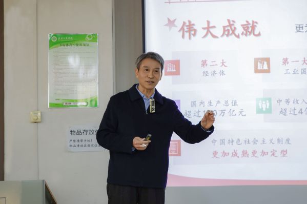 他结合巴以冲突、中国领先全球的5G技术等实际案例,为同学们深入浅出地分析了当前国际形势和新时代青年肩负的历史使命,并号召青年学生要胸怀两个大局,一个是中华民族伟大复兴的战略全局,一个是世界百年未有之大变局。