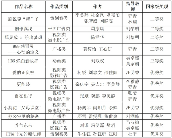 其中,文法学院罗青老师指导的参赛作品《剧说穿“帮”了》(参赛学生:李美静、杜金凤、奚嘉阳、张智威、刘静雯)荣获策划案类全国二等奖;艺术与设计学院刘黎明老师指导的参赛作品《创作真我》(参赛学生:周康康)荣获平面广告类全国二等奖,指导的参赛作品《照见成长 绘出梦想》(参赛学生:陈泽华)荣获视频类微电影广告全国二等奖。