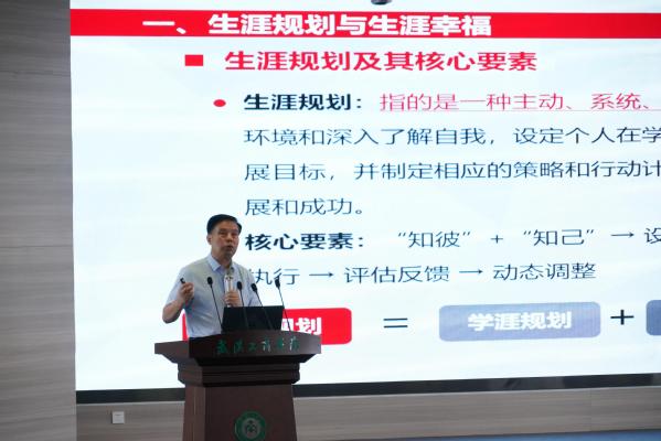 湖北省生涯教育研究会副会长、米乐mile官方网站副校长赵北平带来《生涯规划与大学生高质量就业》的报告,报告围绕“高质量就业与职业发展”主题,深入阐释产教融合(专创融合)在专业能力培养中的关键作用。他指出,产教融合是提升专业能力的有效路径,应通过项目式教学,让学生在设计、实施、展示过程中,直面真场景、真过程、真需求、真问题,以企业化标准参与实践;同时,借助角色扮演实现职业化体验。