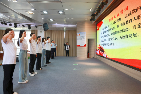 刘生元副校长为新教师代表佩戴校徽,并举起右拳,带领全体新教职工庄严宣誓,签订《师德师风承诺书》。誓言铮铮,是对教育事业的忠诚告白;承诺落笔,是对职业操守的郑重承诺,进一步淬炼了新教师的职业荣誉感与使命感。