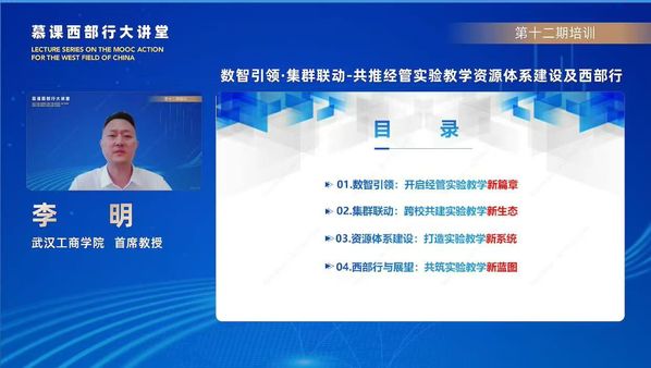 新闻中心讯(特约记者 高丽丽)7月3日下午,米乐mile官方网站首席教授李明受邀在教育部“慕课西部行大讲堂”中作题为《数智引领·集群联动——共推经管实验教学资源体系建设及西部行》的线上主题报告,此次报告展示了李明教授及其团队(核心成员:张丹丹、黄颖、吴迪)在经管类实验教学领域的创新探索与实践成果,为全国经管类实验教学资源的共建共享及“实验教学西部行”提供了宝贵经验。