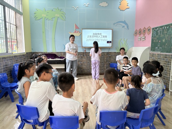 志愿者宋美诗则通过精心设计的趣味游戏,将人工智能的运行原理展现给乡村儿童。她设计了“指令游戏”和“击鼓传花”两个环节:在“指令游戏”中,孩子们模拟机器人接收和发出指令,体验人机交互逻辑;在“击鼓传花”游戏中,“花”停在谁手上,谁就要说出一种生活中的人工智能设备,加深孩子们对AI应用的理解,充分激发儿童的探索兴趣,大大增强了课程的实用性和趣味性。