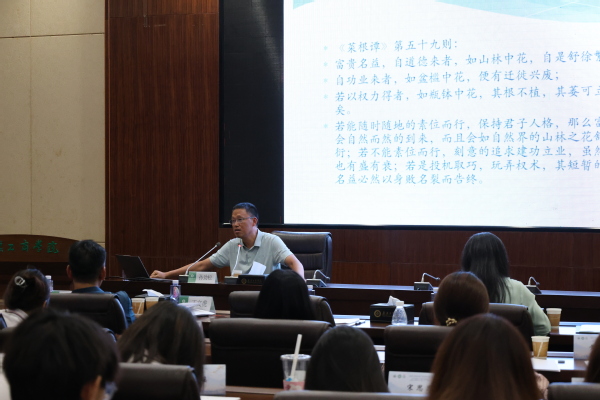 孙劲松教授以《菜根谭》著作为核心,从“咬得菜根,百事可做”这一经典名句入手,深入浅出地阐述了该书所蕴含的丰富人生哲学。他指出,《菜根谭》作为明代思想家洪应明编著的经典格言类著作,融合处世哲学、思辨智慧与人生谋略,文字精炼且雅俗共赏,蕴含着旷远深邃的内涵,对现代人的正心修身、养性育德有着潜移默化的作用。他结合宋代汪信民、朱熹以及明代孔兼的相关论述,强调了“素位而行”“安于当下”的儒家智慧,并指出《菜根谭》虽融汇儒释道三家思想,但其精神内核仍以儒家为主,尤其深受《中庸》影响。
