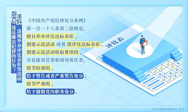 《中国共产党纪律处分条例》第一百一十八条第二款规定,擅自举办评比达标表彰、创建示范活动或者借评比达标表彰、创建示范活动收取费用的,对直接责任者和领导责任者,情节较重的,给予警告或者严重警告处分;情节严重的,给予撤销党内职务处分。规定本条的目的是与相关法规相衔接,将党的十八大以来落实中央八项规定精神和反“四风”的实践成果固化为制度。