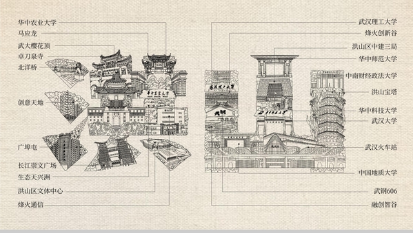 在这组精心构思的作品中,“洪山”二字跃然成为一幅生动的城市画卷。创作团队将武汉大学、华中科技大学、华中农业大学、武汉理工大学等高校的标志性建筑,与马应龙、烽火创新谷、创意天地、融创智谷等产业地标巧妙嵌合。卓刀泉、武汉火车站、天兴洲等融合历史与未来的地理符号,亦作为笔画细节细腻融入,真正做到了“字中有画,画中藏意”,既彰显洪山作为“大学之城”的厚重文脉,也勾勒出其作为“创新热土”的当代活力。