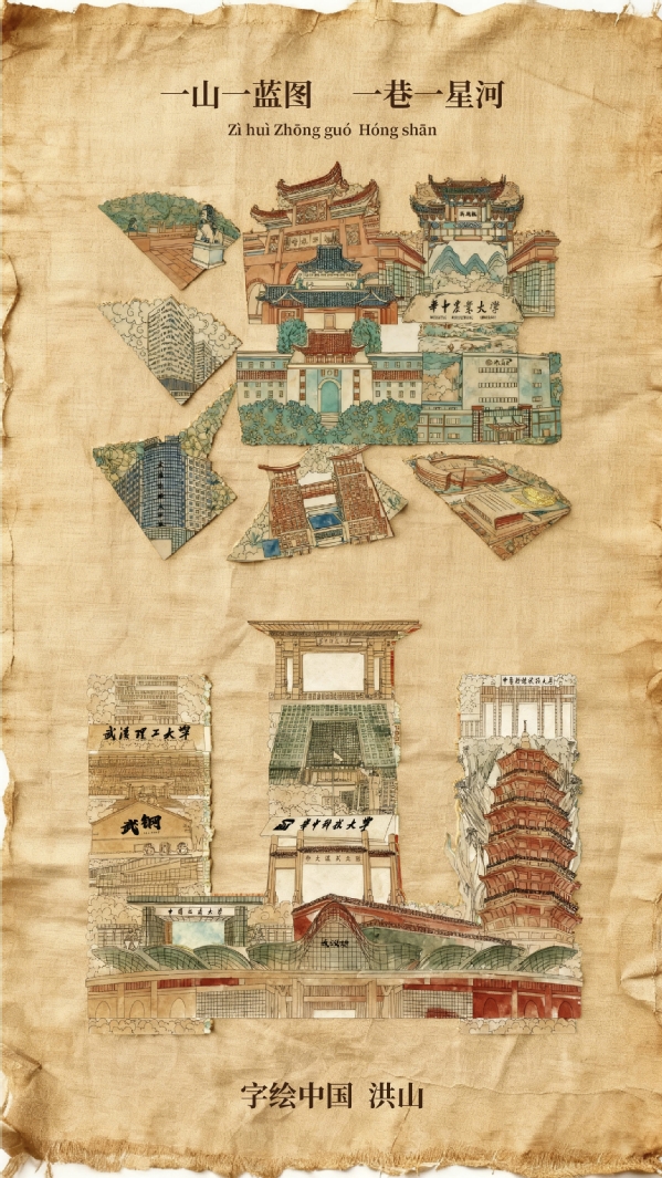 在这组精心构思的作品中,“洪山”二字跃然成为一幅生动的城市画卷。创作团队将武汉大学、华中科技大学、华中农业大学、武汉理工大学等高校的标志性建筑,与马应龙、烽火创新谷、创意天地、融创智谷等产业地标巧妙嵌合。卓刀泉、武汉火车站、天兴洲等融合历史与未来的地理符号,亦作为笔画细节细腻融入,真正做到了“字中有画,画中藏意”,既彰显洪山作为“大学之城”的厚重文脉,也勾勒出其作为“创新热土”的当代活力。