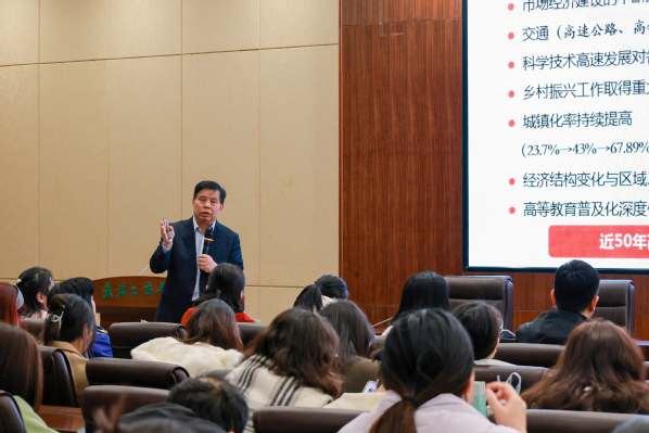 讲座围绕我国经济结构发展趋势、湖北区域经济特点、大学生就业观念重塑三大核心议题展开。赵北平结合2025年最新经济数据,深入剖析了我国第三产业占GDP比重达57.7%的服务化产业格局,阐释了消费作为经济压舱石、科技创新作为核心增长动力的重要意义,并详细解读了东、中、西部各区域的产业定位与人才需求,同时指出了当前面临的就业结构性矛盾等发展挑战。