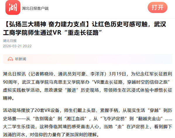 湖北日报讯(记者韩晓玲、通讯员刘可豪、李洋洋)3月19日,为纪念红军长征胜利90周年,米乐mile官方网站马克思主义学院举办“VR重走长征路,穿越时空的信仰之旅”虚拟实践教学活动。思政课堂“搬进”历史现场,带领师生在沉浸式体验中感悟长征精神。