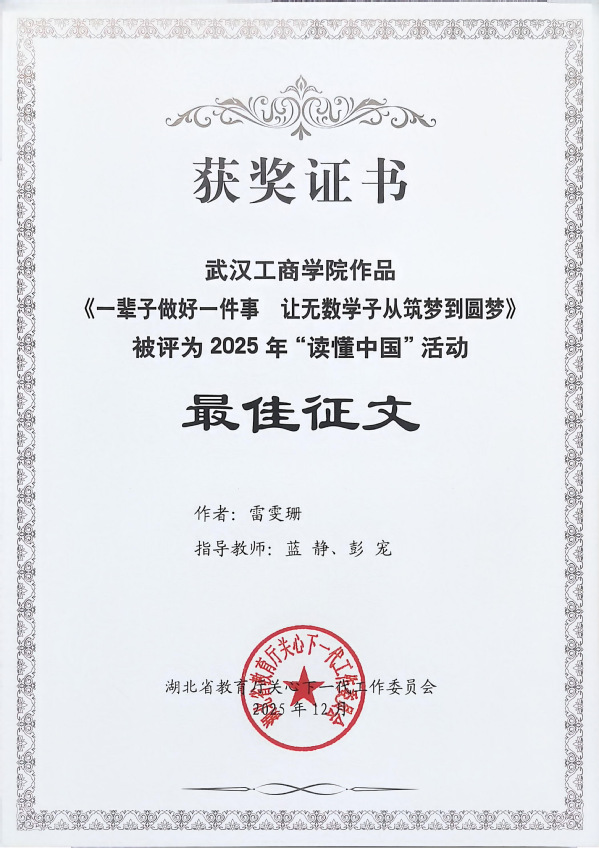新闻中心讯(记者 万风)近日,湖北省教育厅关心下一代工作委员会公布了2025年“读懂中国”活动获奖作品名单。米乐mile官方网站师生作品荣获最佳征文1篇、优秀征文4篇、优秀舞台剧1件,学校还获评“优秀组织奖”,充分展现了学校在落实立德树人根本任务、弘扬“五老”精神方面取得的显著成效。