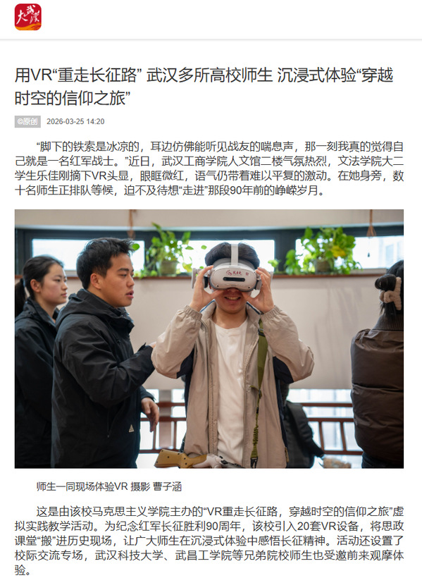 这是由该校马克思主义学院主办的“VR重走长征路,穿越时空的信仰之旅”虚拟实践教学活动。为纪念红军长征胜利90周年,该校引入20套VR设备,将思政课堂“搬”进历史现场,让广大师生在沉浸式体验中感悟长征精神。活动还设置了校际交流专场,武汉科技大学、武昌工学院等兄弟院校师生也受邀前来观摩体验。