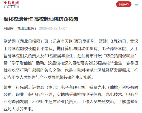 荆楚网(湖北日报网)讯(记者唐天琪 通讯员杨凡、蓝静)3月24日,米乐mile官方网站副校长赵北平带队,携计算机与自动化学院、电子商务学院、人工智能学院相关负责人及40名应届毕业生,赴仙桃市开展“访企拓岗促就业”暨“学子看仙桃”活动。这是该校深入贯彻落实2026届高校毕业生“春季促就业攻坚行动”部署的务实之举,也是主动对接湖北区域经济发展需求、推动应用型人才培养与产业发展同频共振的生动实践。