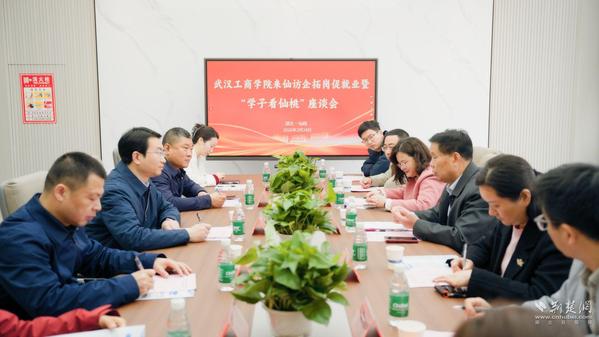 随后,校地合作座谈会在职业工装电商产业园会议室举行。仙桃市人力资源和社会保障局党组书记、局长向宇,副局长张鹏等与学校代表围绕校地人才共育、产教融合展开深入交流。向宇书记等重点介绍了仙桃市产业发展规划及人才需求,详细解读了以“沔才卡”等人才服务政策,希望用一系列“真金白银”的举措,吸引优秀毕业生到仙桃市就业。