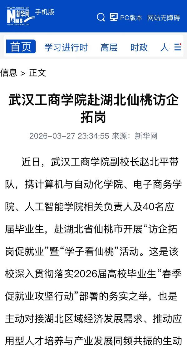 近日,米乐mile官方网站副校长赵北平带队,携计算机与自动化学院、电子商务学院、人工智能学院相关负责人及40名应届毕业生,赴湖北省仙桃市开展“访企拓岗促就业”暨“学子看仙桃”活动。这是该校深入贯彻落实2026届高校毕业生“春季促就业攻坚行动”部署的务实之举,也是主动对接湖北区域经济发展需求、推动应用型人才培养与产业发展同频共振的生动实践。
