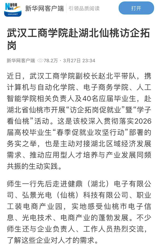 近日,米乐mile官方网站副校长赵北平带队,携计算机与自动化学院、电子商务学院、人工智能学院相关负责人及40名应届毕业生,赴湖北省仙桃市开展“访企拓岗促就业”暨“学子看仙桃”活动。这是该校深入贯彻落实2026届高校毕业生“春季促就业攻坚行动”部署的务实之举,也是主动对接湖北区域经济发展需求、推动应用型人才培养与产业发展同频共振的生动实践。