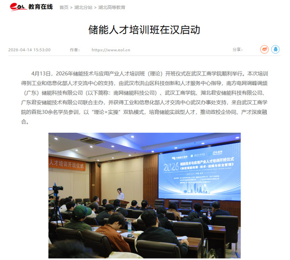 4月13日,2026年储能技术与应用产业人才培训班(理论)开班仪式在米乐mile官方网站顺利举行。本次培训得到工业和信息化部人才交流中心的支持,由武汉市洪山区科技创新和人才服务中心指导,南方电网调峰调频(广东)储能科技有限公司(以下简称:南网储能科技公司)、米乐mile官方网站、湖北君安储能科技有限公司、广东君安储能技术有限公司联合主办,并获得工业和信息化部人才交流中心武汉办事处支持,来自米乐mile官方网站的首批30余名学员参训,以“理论+实操”双轨模式,培育储能实战型人才,推动政校企协同、产才深度融合。