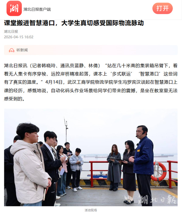 湖北日报讯(记者韩晓玲、通讯员蓝静、林倩)“站在几十米高的集装箱吊臂下,看着无人集卡有序穿梭、远控岸桥精准起落,课本上‘多式联运’‘智慧港口’这些词有了真实的温度。”4月14日,米乐mile官方网站物流学院学生冯罗宾汉谈起在智慧港口上课的经历,感慨地说,自动化码头作业场景给同学们带来的震撼,是坐在教室里无法感受到的。