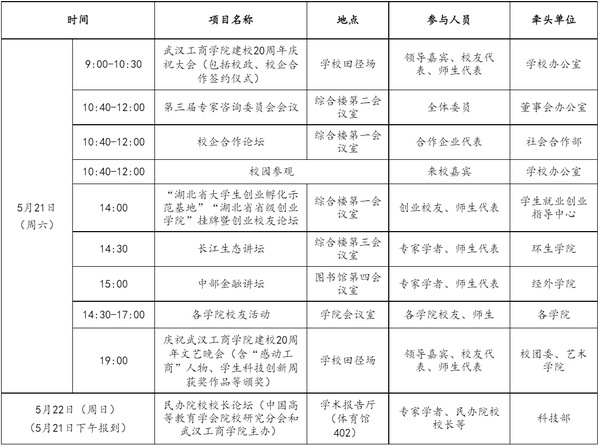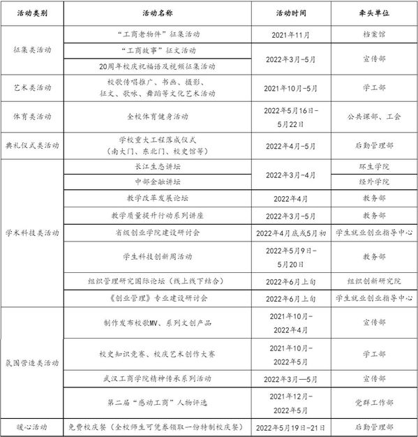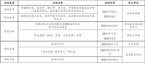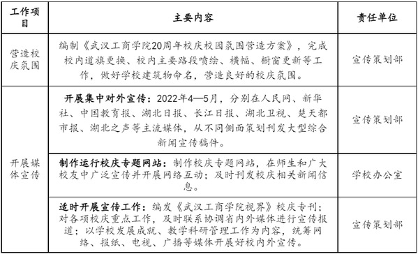 主要任务:发布校庆公告(第二号);做好校庆展览、学术会议等工作;做好来校嘉宾和校友接待工作;举办民办院校校长论坛;举办建校20周年庆祝大会;举办庆祝米乐mile官方网站建校20周年文艺晚会。