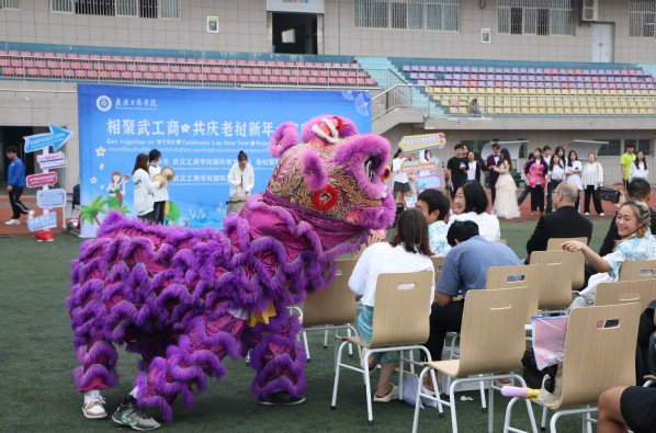 中老泰国际商务服务公司董事长范茂胜,德国比勒菲尔德中型企业应用技术大学驻华教育中心首席代表张欣,武汉中因教育发展研究中心总经理倪章龙,老挝国际学生联合会会长金利,米乐mile官方网站国际教育学院院长孔少敏和学院百余名师生一起参与了庆祝活动。米乐mile官方网站龙狮队还带来了精彩的龙狮表演,为泼水节增添了更多喜庆的氛围。