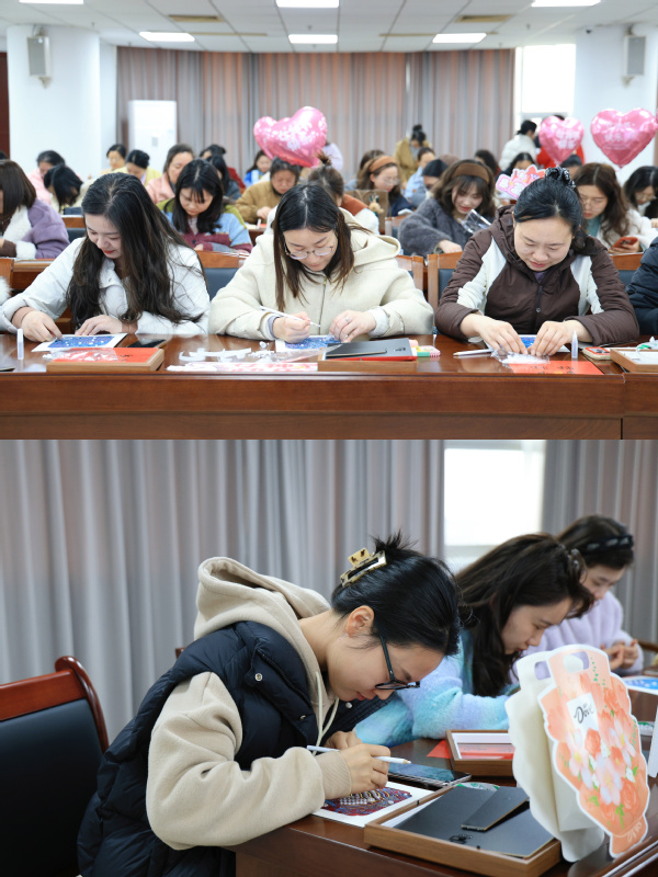 活动现场,粉色的爱心气球上“女神节快乐”的字样格外醒目,“颜值担当”“貌美如花”“女王驾到”等趣味手举牌更添几分俏皮,将节日氛围烘托得温馨又热烈。女教职工们围坐在铺满材料的长桌前,全神贯注地投入到自己的创作中。她们有的低头沉思,精心挑选着与锦纹相配的珍珠;有的手持点珠笔,凝神静气地将米粒大小的珍珠稳稳粘在预定位置;还有的互相品评,交流着配色与构图的巧思。一双双平日里握笔板书、敲击键盘的手,此刻化身为巧手的匠人。随着最后一颗珍珠落定,一幅幅融合了宋锦古韵与珍珠华彩的立体画作逐渐呈现,或清雅含蓄,或富丽堂皇,各具特色。