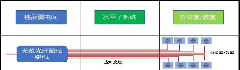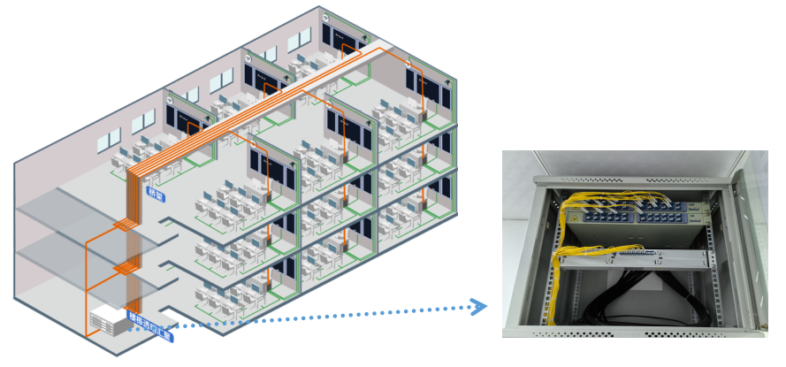 所有教室光纤汇聚到楼层的弱电间,通过无源汇聚设备进行光纤汇聚,然后再上联至信息中心核心交换机,所有房间的光纤互联做好标识,光纤汇聚间无须部署电源、空调等,方便管理。