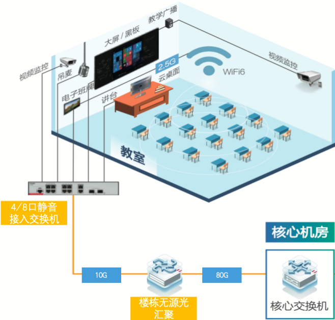 教室内部署1台8口/16口POE静音交换机,上连万兆到楼层无源光汇聚设备,下联千兆到教室内部有线终端;