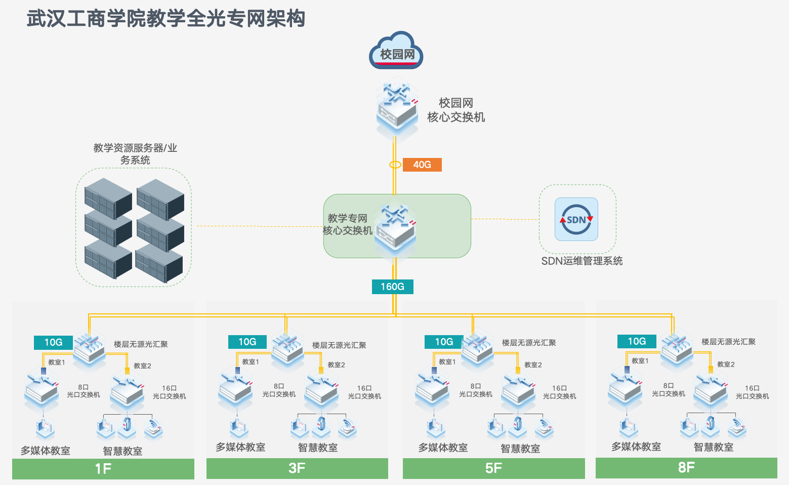 教学楼每层楼弱电间采用无源设备光纤汇聚,单芯上联160G到机房专网核心交换机、下联万兆入教室;