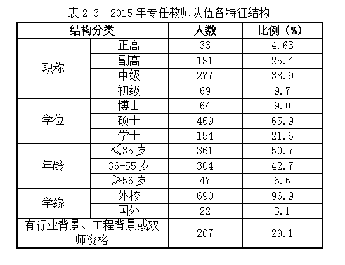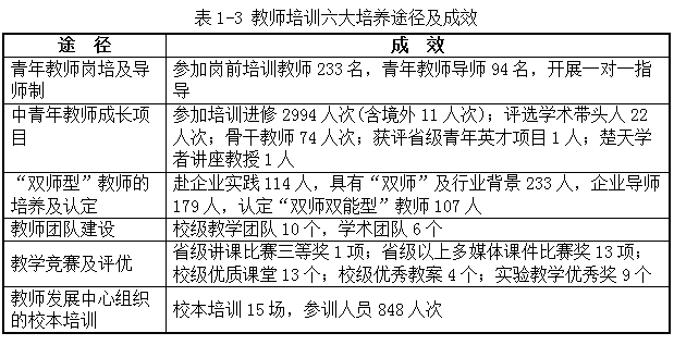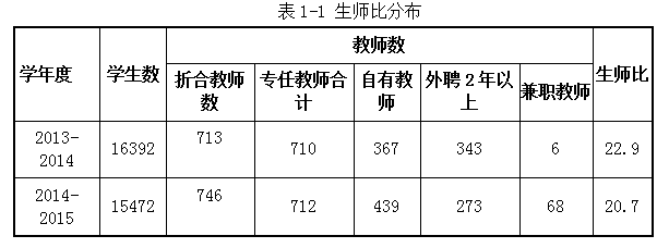 一、“十二五”师资队伍建设工作回顾 学校大力实施“人才强校”战略,坚持引进、培养、使用相结合,以提高师资队伍综合素质为主线,以提升教师能力水平为核心,以培养中青年教师为重点,以优化人才发展环境为保障,提升师资队伍整体水平。 (一)教师队伍满足需要,教师结构日趋合理 通过大力引进、培养和适度外聘等方式,为人才提供有吸引力的薪酬待遇,采取配套科研经费和住房等措施,努力建设一支师德优良、规模适宜、结构合理、水平较高的教师队伍。教师数量、结构能满足应用型人才培养需要。 1.增加专任教师数量,生师比满足要求 现有专任教师712人,兼职教师68人,折合教师746人,生师比20.7:1(见表1-1),达到国家办学条件要求。 各专业的教师数量满足本专业教学需要;学校通过合理控制班级规模,提高课堂教学质量,公共数学采用分级教学,外语或实验课在40人以内,专业课控制在2个教学班以内;实施本科生导师制,每年安排近200名教师承担本科生导师工作,参与学生的学习辅导。 2.采取多种有效措施,教师结构日趋合理 加大博士学历教师和有实践经验教师的引进力度,实施教师分类管理、赴企业实践等措施,教师队伍的年龄、学历、专业技术职务等结构不断改善(详见表1-2)。 专任教师中具备行业(专业)职业资格和任职经历的教师为207人,占29.1%。符合岗位资格的教师占在编主讲教师比例为97.9%。 出台《师德师风建设工作实施办法》、《学术道德规范》等制度,加强师德教育与师风建设,教师从严执教,为人师表,严谨治学,能满足人才培养目标的要求。 1.构建师德长效机制,为人师表蔚然成风 一是加强师德师风的培养教育,倡导“爱与责任”,将师德师风作为新教师岗前培训的必修课程。二是邀请国家级教学名师等进行师德讲座;三是坚持师德考核,从职业道德、敬业精神、教书育人等方面综合考评,职称评审、年度考核实施师德“一票否决制”。十二五期间,30人获省市级及以上思政、德育等奖励;评选出“我最喜爱的教师”19人,“三育人”代表21人;从严处理教学事故38起;未出现违反学术道德规范的事件。 教师围绕应用型人才培养积极开展教研教改,将教研成果应用于教学,效果良好,教师参加教学竞赛获省级以上奖励15项,其中获外研社全国大学英语教学之星比赛三等奖1项,湖北省青年教师讲课比赛三等奖1项;实践指导总体符合学校应用型人才培养需要,如“三学期制”教学改革在文法学院的推广应用,取得扎实成效。学生整体满意,对教师课堂教学质量评价的优良率平均达94.5%。 (三)重视教师培养提高,整体素质稳步上升 以满足教师的个性化需求为出发点,以促进教师的专业发展为落脚点,形成了颇具特色、初见成效的教师培养培训体系。 1.构建培训体系,完善管理制度 (1)成立教师发展中心 2015年成立教师发展中心,以满足教师职业发展需求为导向,用多元化、国际化、复合型、实践型、实用性的知识结构打造教师教育发展平台,实现“提升、融合、评价、研究”四项功能。 (2)健全教师管理制度 出台《新进教师考核管理办法》、《师德师风建设工作实施办法》、《教学团队建设与管理办法》、《培训管理办法》、《教师实践能力培养办法》等制度,明确教师职责,强化教师教书育人的责任感,加强团队建设和人才梯队建设,提升教师教学、科研和实践能力。 (3)构建立体化教师培训体系 以教师的岗位培训和学历学位教育为中心,以教师个人职业发展规划为指引,提出“四化”的培养方向,即“硕博化、专业化、国际化、双师化”,鼓励教师进一步深造,攻读博士学位,提升教学科研和实践应用能力,拓展国际化视野,促进教师培训系统化、规范化。 2.畅通六大途径,实施校院两级协同和分类指导 (1)精心组织,助力教师快速成长 通过六大培养途径(详见表1-3),大力推进教师的培养培训和提高,十二五期间,用于人才项目和培训的经费达1630.1万元。 (2)实施校院两级协同培养 学校将教师队伍建设工作纳入校院两级年度考核目标,将教师招聘、培训、职称晋升、聘期考核的权限交给二级学院。同时各二级学院通过不同方式加强教师培养,依托校级学术带头人、骨干教师,通过学术团队、教学团队等建设平台,引导教师发展。 (3)开展教师发展分类指导与评价 一是加强青年教师的专业培训,对新进教师加强岗前培训,使之站稳讲台;通过示范课、听课、说课、评课等夯实青年教师教学基础;通过青年教师导师制,帮助青年教师提升教学和科研能力。二是加强对骨干教师的转型培训,包括新思维方式、新教学信息技术、理论前沿及应用型人才如何培养的培训,通过促进骨干教师的转型来带动人才培养的转型。 实施教师岗位分类管理。设置教学为主型、教学科研并重型、科研为主型三种岗位,教师在教学、教研、科研方面的聘期任务各有侧重,并有明确的发展目标。教师根据自身特点及岗位要求,选择适合的岗位,促进教师不断成长。 (4)推行“双百”计划,加强“双师型”教师队伍建设 实施“双百计划”,一是安排百名教师到企业实践,参与企业项目、研究企业中的问题,有效将教学内容与企业实践的结合,培养教师实践认知和实践操作能力;二是聘请百名企业高级管理和工程技术人员来校担任企业导师,指导本科生教育教学工作,强力推进“双师型”队伍建设。 3.教师培