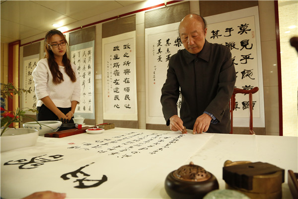 上午11:00,该校顾问陶梅生教授也来到现场挥毫泼墨。“浮舟沧海,立马昆仑”“博观约取”……陶梅生教授运用金文和行书现场题字,其书法厚重有力又不失清秀,给人以视觉的冲击,并教在场的学生在书法中应该如何书法运笔和行款、钤章。“书法运笔的方法有逆锋起笔、中锋行笔、转笔等,全身的力量通过手臂、手腕,到达笔尖,手腕的力量尤其重要。书法作品上的印章,是作品中不可缺少的组成部分。印章有闲章和姓名之分,不仅能使书法作品增色,起到‘锦上添花’的效果,而且能调整重心,是作品布局上必不可少的部分。”陶教授对现场的学生说道。