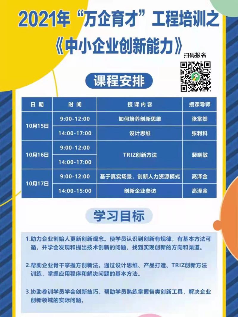 2021年“万企育才”工程培训之《中小企业创新能力》培训开始报名啦!
