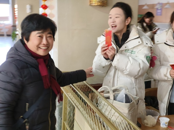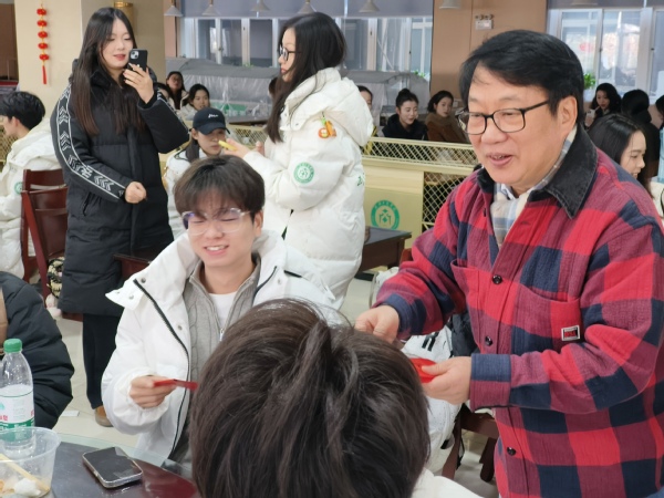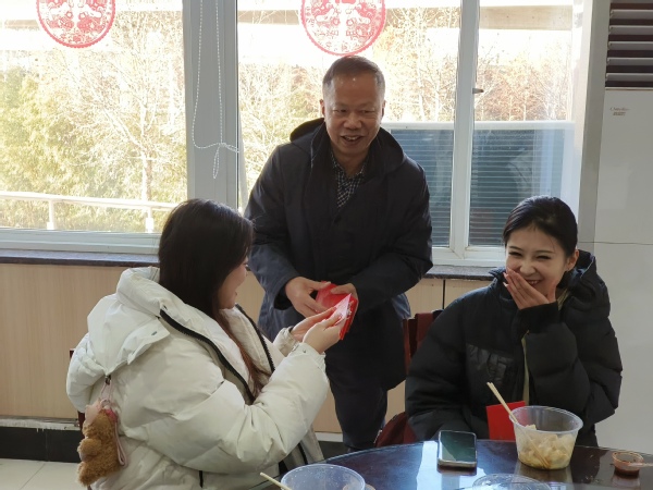 1月28日上午9:30,除夕当天,学校副校长桂裕清、总会计师王程军,艺术与设计学院院长许开强、党总支书记罗筱芳等一行还专程前往学校食堂,看望慰问了即将启程参加春晚演出的师生们,现场为每一位师生发放新年红包,送上新春的美好祝福,并预祝晚上的直播演出圆满成功,大家还一同围坐在一起吃上了热腾腾的饺子。
