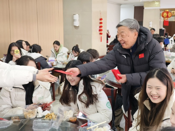 图为副校长桂裕清、总会计师王程军,艺术与设计学院院长许开强、党总支书记罗筱芳为师生们发放新年红包