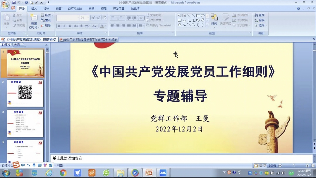 电子商务学院青年马克思研究分会讯(记者:杨心如,摄影:杨心如) 12月2日中午12:30,电子商务学院在线上开展第十三期党校,王曼老师给党校同学讲解中国共产党发展党员工作细则。