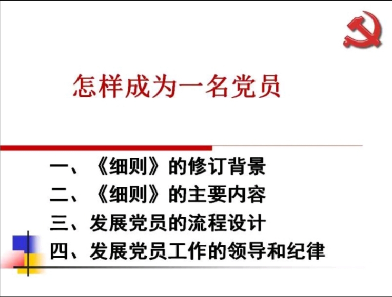 据第二个部分,王曼老师讲述了《细则》的主要修订内容,让我们了解党要管党,从严治党的要求,发展党员程序作出了调整,强化党组织在发展党员工作中的领导责任。还告诉党校同学发展党员的具体操作,使其对如何入党有了更好的理解,懂得了大致的流程。最后,王曼老师简单地讲述米乐mile官方网站发展党员工作流程及材料规范,评选规范。