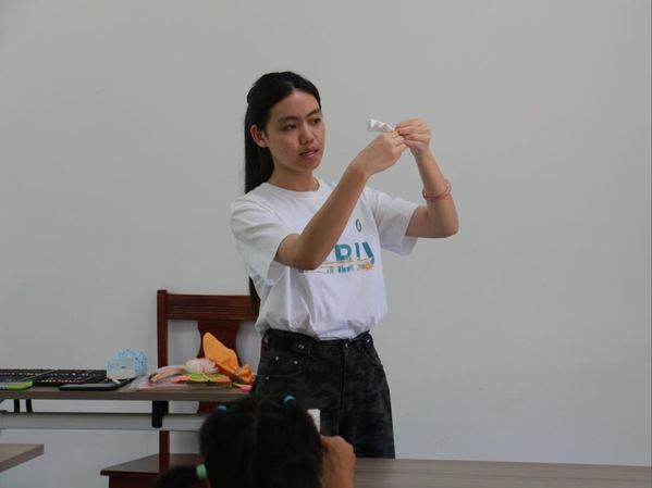 随后在下午的“纸巾花制作”课堂上,普通的纸巾成为了孩子们施展创造力的神奇材料。志愿者们首先展示了如何将平凡纸巾蜕变为美丽花朵的奇妙过程,迅速点燃了孩子们的热情。课堂上,一双双小手专注地折叠、塑形、染色。孩子们在志愿者的悉心指导下,学习基础的折叠技巧,体验色彩的调配乐趣。遇到困难时,身边总有志愿者俯身轻声指导、示范;每当成功完成一朵花的雏形,小脸上便绽放出惊喜与自豪的笑容。整个教室洋溢着轻松愉悦的创作氛围,剪刀的咔嚓声、同伴间的交流声与完成作品的欢呼声交织在一起。当一朵朵色彩缤纷、形态各异的纸巾花在孩子们手中“盛开”时,他们兴奋地互相展示、比较,成就感油然而生。这堂充满趣味的手工课,不仅锻炼了孩子们的动手能力和专注力,更让他们在亲手创造美的过程中收获了快乐与自信,悄然播下了艺术感知的种子。