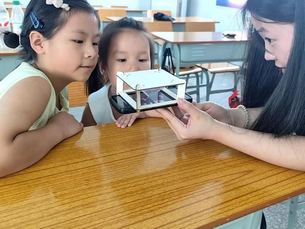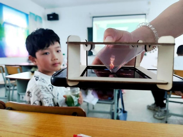 图为孩子们观察全息影像简易装置 摄影:杨慧
