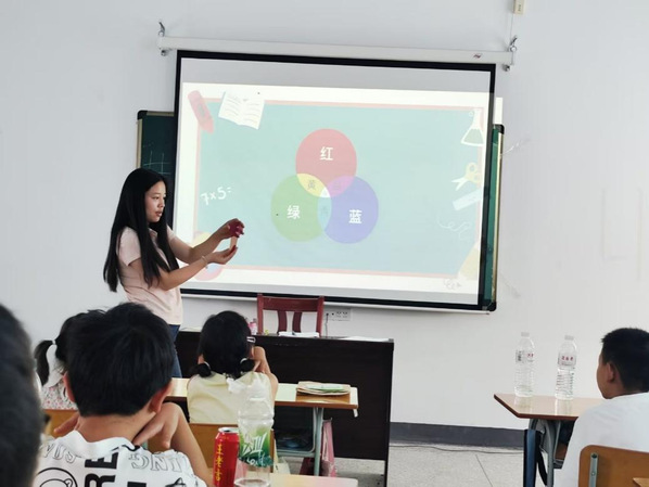 课程最亮眼的部分,当属志愿者李雪带来的“光的三原色”原理实验。她化繁为简,用红、绿、蓝对应滤色片和手电筒作为“画笔”,将抽象的光学原理化作眼前变幻的鲜活色彩。当红光与绿光温柔交汇,一片明亮的黄在幕布上跃然而生;蓝光与绿光相融,清澈的青色流淌开来;而红光拥抱蓝光,则诞生了梦幻的品红色。孩子们屏息凝视,恍然大悟:“原来电视里那么多颜色,是红绿蓝‘变’出来的!”理论瞬间变得可触可感。孩子们更跃跃欲试,分组动手操作光片,亲眼见证色彩融合的魔法,科学探索的种子悄然播撒心田。