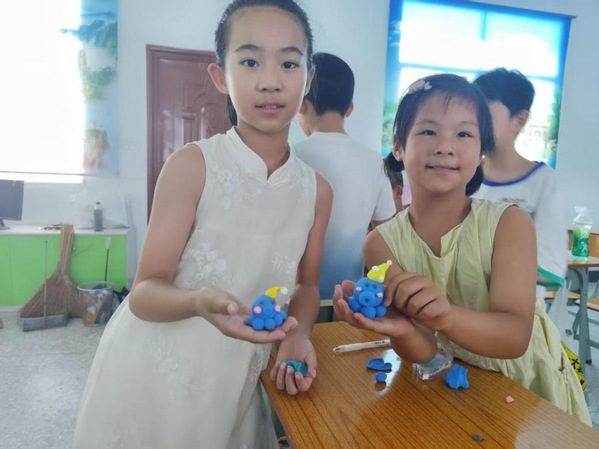 图为孩子们展示超轻黏土作品 摄影:杨慧