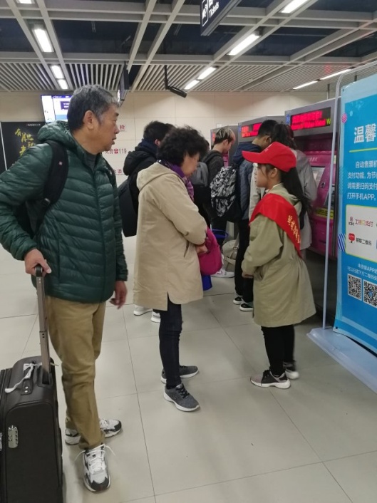 随后,志愿者们与2位带队老师一同在7个岗位上亲身实践,积极投入到志愿服务中。当遇到一些对路线有疑问或是不知道怎样操作自动售票机购票的乘客时,他们都会很耐心地上前指引和讲解,并帮助一些需要帮助的人购票和进出站。
