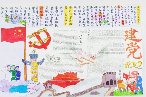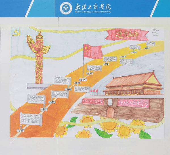 据悉,实践教学活动紧紧围绕画党史、写党史、寻党史、颂党史、演党史等,学生可根据所学内容结合自身挑选一至两个开展,而展现的百幅画作亦是经过课部老师层层筛选最终呈现在大众面前。它们紧紧围绕百年党史,主题突出、内容丰富,形式多样、风格各异,表达了爱党爱国爱社会主义的真挚情感,展现了武工商学子多才多艺、昂扬向上的精神。