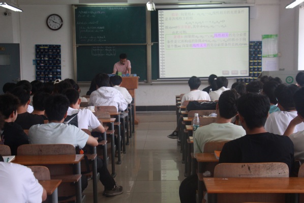 郭欢欢老师讲授的内容是“向量组的线形相关性”。在教学上他结合PPT和板书,与学生积极互动,形成了良好的课堂氛围。他以例题为导入向学生讲述新的知识点,并引导学生进行课堂例题解析的方式来检验学生掌握的程度,以便做教学进度调整。